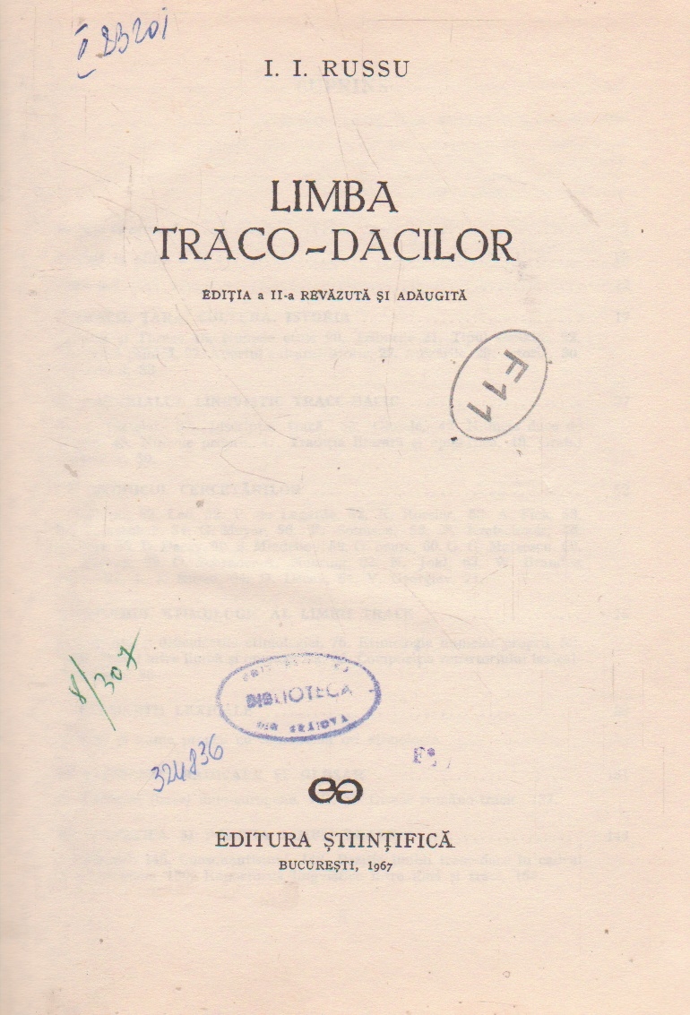 Comandă online cartea "Limba traco-dacilor" la 30,70 lei scrisă de I. I. Russu, tiparită la editura Stiintifica în anul 1967 cu un număr de 254 pagini. cu plata ramburs sau online cu cardul. Momentan titlul "Limba traco-dacilor" nu este disponibil însa vă puteți înscrie pentru a fi notificat în momenul reaprovizionarii.