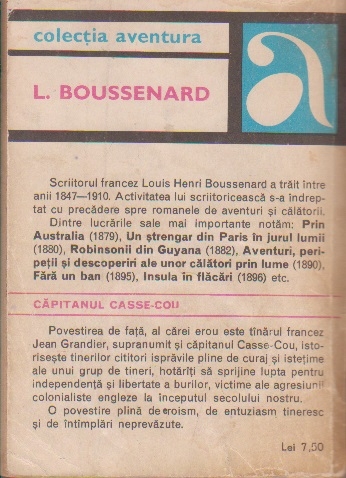Cartile semnate de L. Boussenard, majoritatea atractive romane de aventuri si jurnale de calatorie, se bucura si astazi de un larg interes in randurile tinerilor cititori. Astfel, romanul al carui erou este francezul Jean Grandier, supranumit capitanul Casse-Cou, urmareste aventurile unui grup de tineri implicati in razboiul de independenta al burilor. O carte in care veti intalni fapte pline de eroism, entuziasm tineresc si neprevazut!